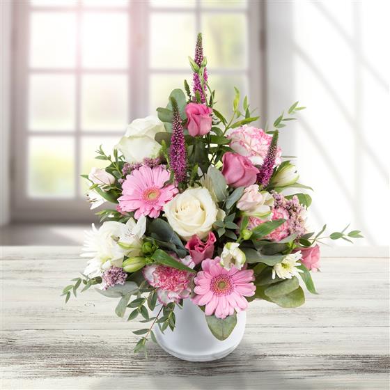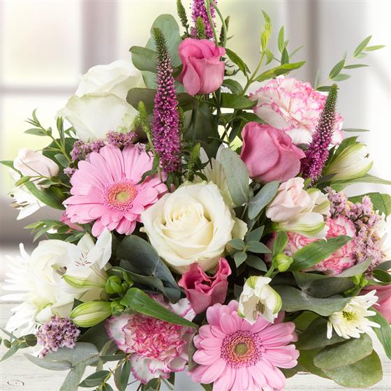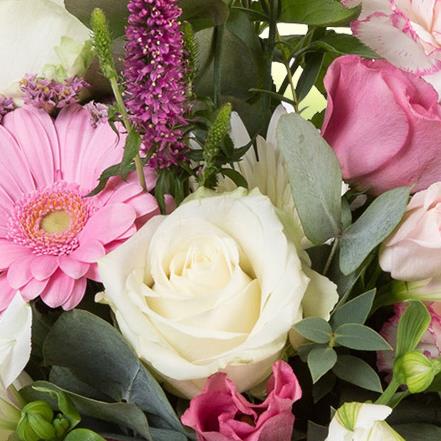 A delightful arrangement in pastel pinks and creams, including roses, veronica, mini gerberas and eucalyptus.